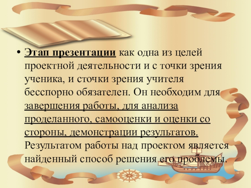 зрения ученика, и сточки зрения учителя бесспорно обязателен. Он необходим для завершения работы, для анализа проделанного, самооценки и оценки со стороны, демонстрации результатов. Результатом работы над проектом является найденный способ решения его проблемы.
