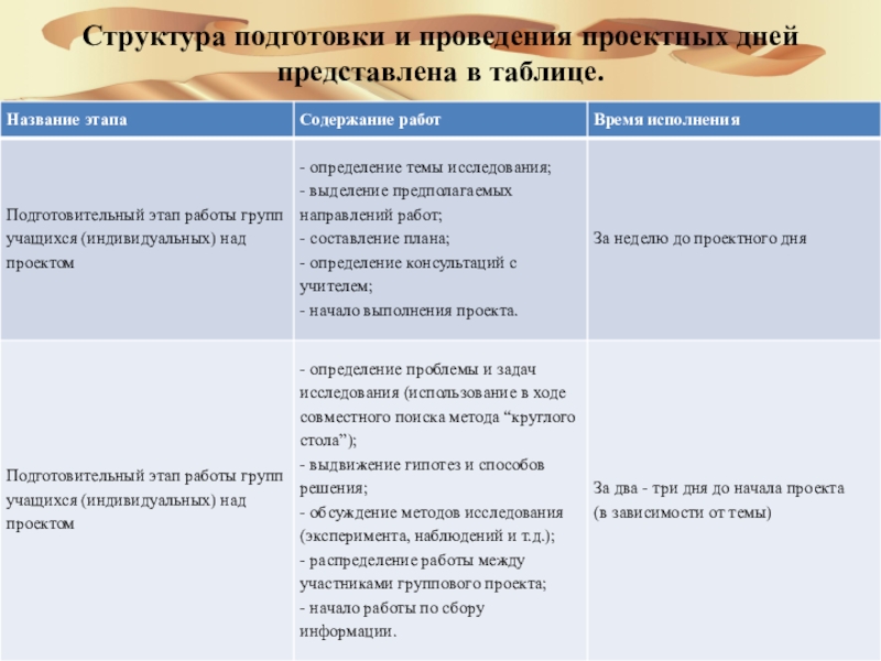 Слайд 37Структура подготовки и проведения проектных дней представлена в таблице.