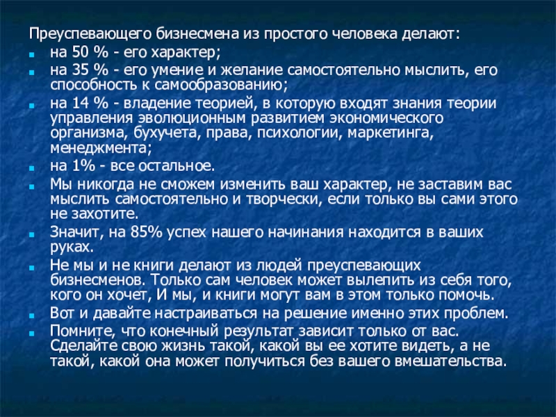 Преуспевающего бизнесмена из простого человека делают:на 50 % - его характер;на 35 % - его умение и желание самостоятельно мыслить, его способность к самообразованию;на 14 % - владение теорией, в которую входят знания теории управления эволюционным