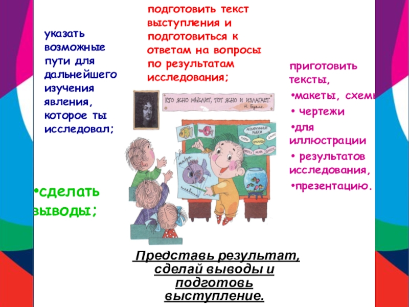 подготовить текст выступления и подготовиться к ответам на вопросы по результатам исследования;