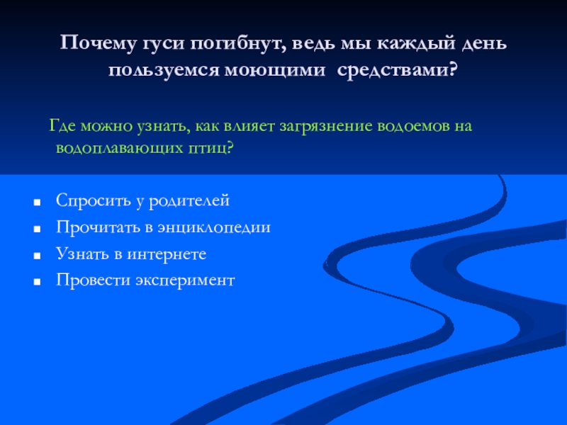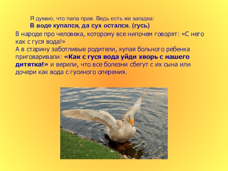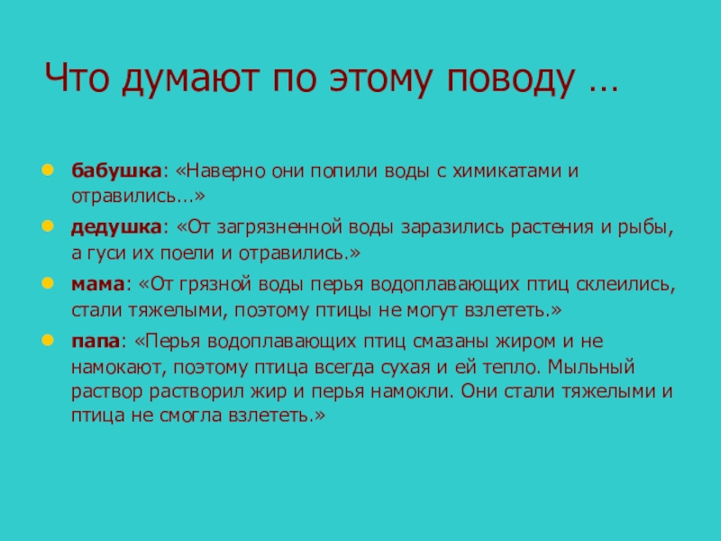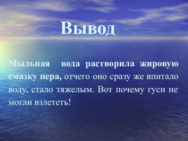 Мыльная вода растворила жировую смазку пера, отчего оно сразу же впитало воду, стало тяжелым. Вот почему гуси не могли взлететь!