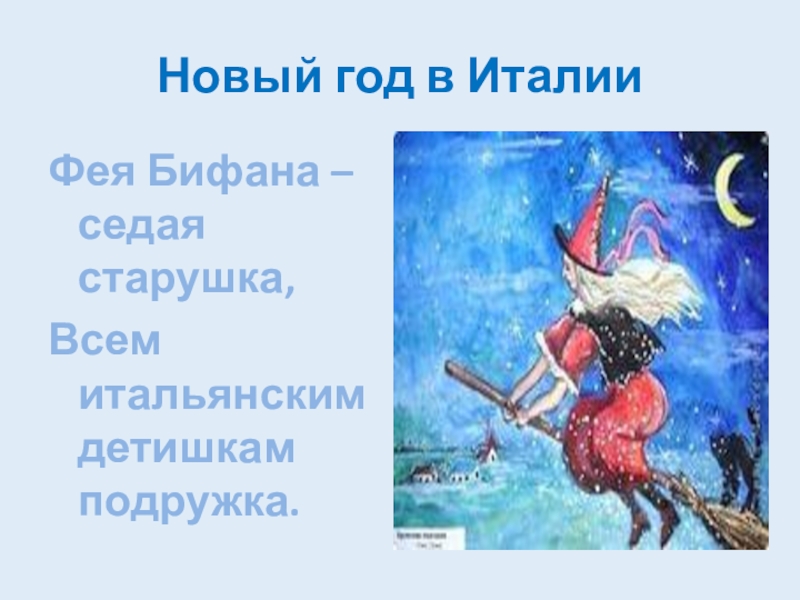 Новый год в ИталииФея Бифана – седая старушка,	Всем итальянским детишкам подружка.