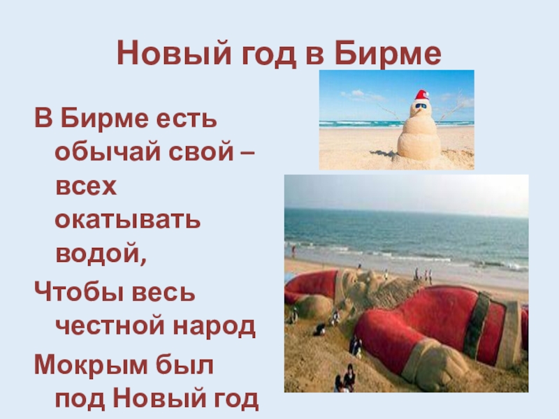 Новый год в БирмеВ Бирме есть обычай свой – всех окатывать водой, 	Чтобы весь честной народ	Мокрым был