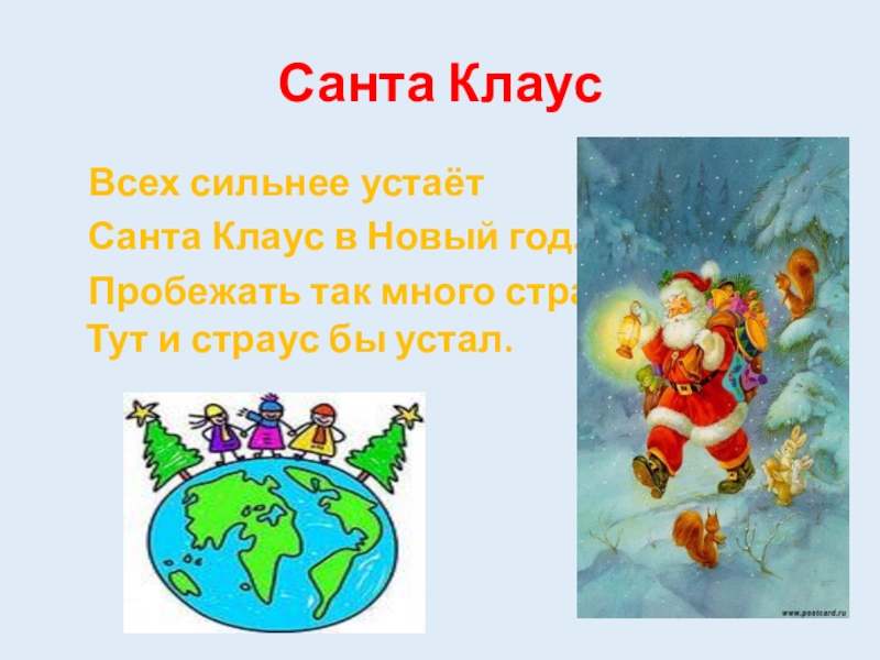 Санта Клаус  Всех сильнее устаёт	  Санта Клаус в Новый год.	  Пробежать так много стран