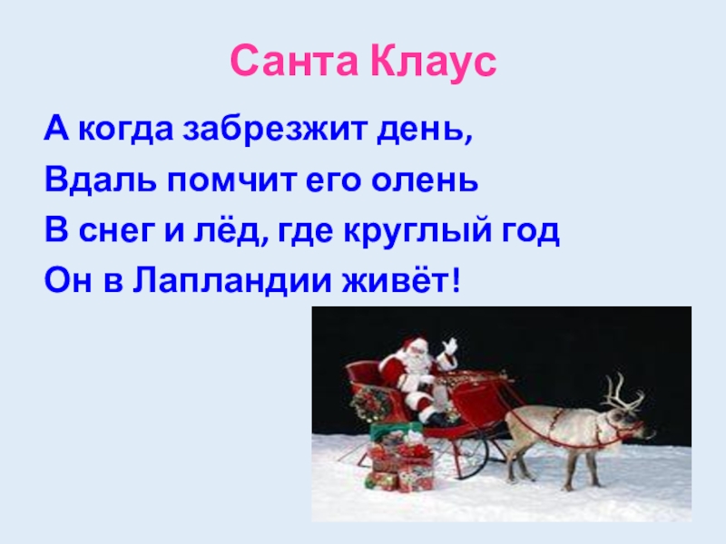 Санта КлаусА когда забрезжит день,	Вдаль помчит его олень	В снег и лёд, где круглый год	Он в Лапландии живёт!