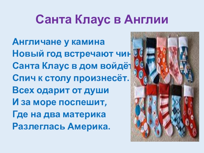Санта Клаус в АнглииАнгличане у камина	Новый год встречают чинно.	Санта Клаус в дом войдёт,	Спич к столу произнесёт.Всех одарит