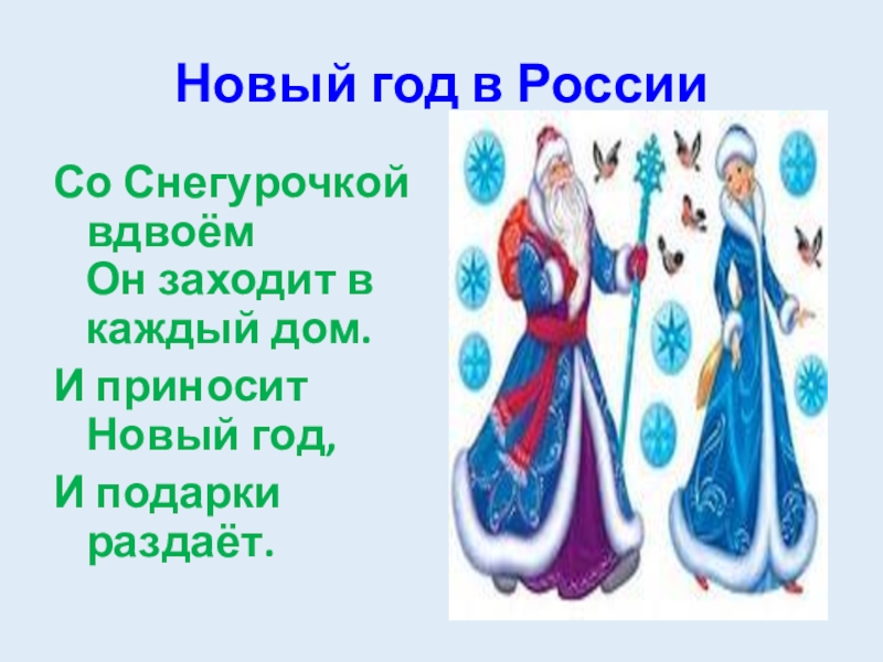 Новый год в РоссииСо Снегурочкой вдвоём        Он заходит в каждый