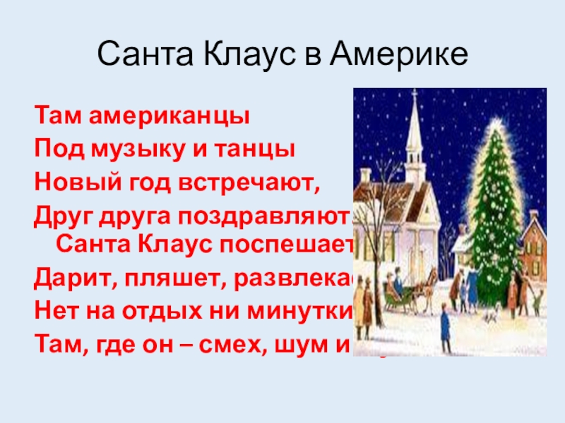Санта Клаус в АмерикеТам американцы	Под музыку и танцы	Новый год встречают,	Друг друга поздравляют.