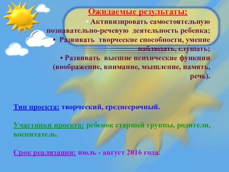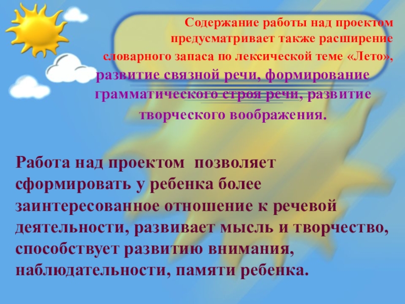 Работа над проектом позволяет сформировать у ребенка более заинтересованное отношение к речевой деятельности, развивает мысль и творчество, способствует развитию внимания, наблюдательности, памяти ребенка.