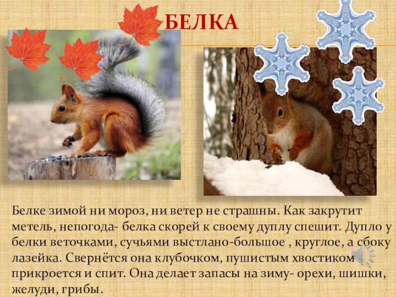 БЕЛКА Белке зимой ни мороз, ни ветер не страшны. Как закрутит метель, непогода- белка скорей к своему