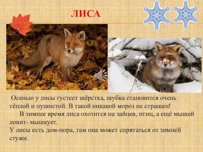 ЛИСА Осенью у лисы густеет шёрстка, шубка становится очень тёплой и пушистой. В такой никакой мороз не
