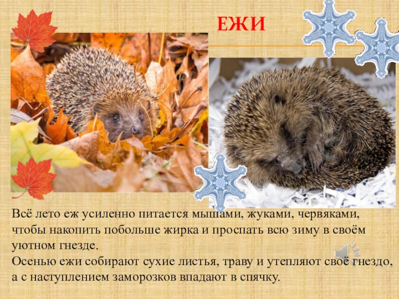 усиленно питается мышами, жуками, червяками, чтобы накопить побольше жирка и проспать всю зиму в своём уютном гнезде. Осенью ежи собирают сухие листья, траву и утепляют своё гнездо, а с наступлением заморозков впадают в спячку.