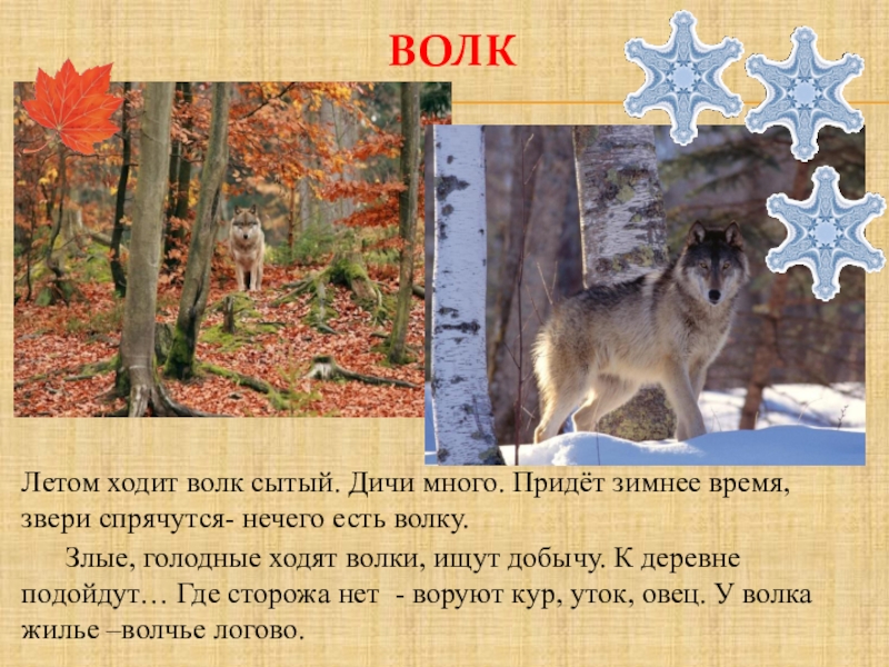 ВОЛКЛетом ходит волк сытый. Дичи много. Придёт зимнее время, звери спрячутся- нечего есть волку.	Злые, голодные ходят волки,