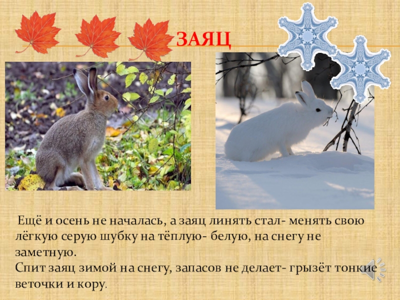 ЗАЯЦ Ещё и осень не началась, а заяц линять стал- менять свою лёгкую серую шубку на тёплую-