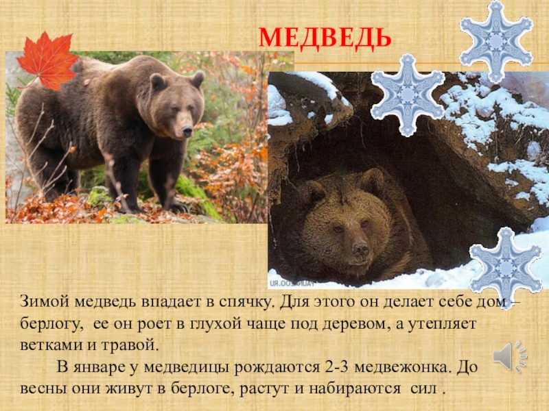 МЕДВЕДЬЗимой медведь впадает в спячку. Для этого он делает себе