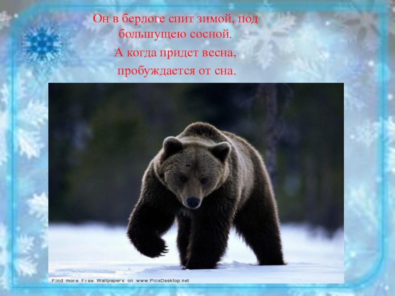 Он в берлоге спит зимой, под большущею сосной. А когда придет весна, пробуждается от сна.