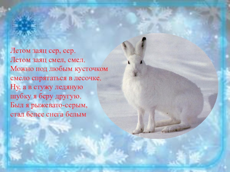 в лесочке. Ну, а в стужу ледяную шубку я беру другую. Был я рыжевато-серым, стал белее снега белым