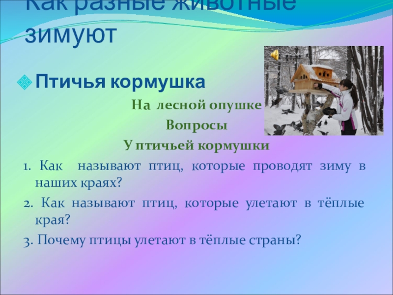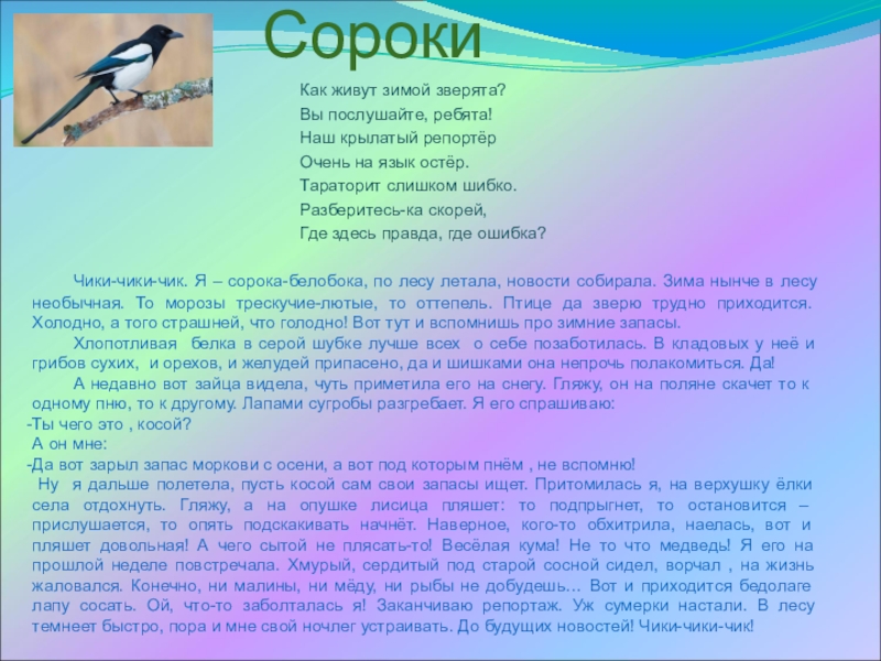 Чики-чики-чик. Я – сорока-белобока, по лесу летала, новости собирала. Зима нынче в лесу необычная. То морозы трескучие-лютые, то оттепель. Птице да зверю трудно приходится. Холодно, а того страшней, что голодно! Вот тут и вспомнишь про зимние запасы.