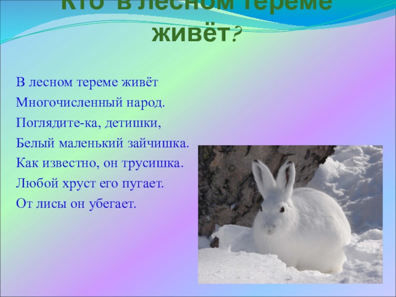 А недавно вот зайца видела, чуть приметила его на снегу. Гляжу, он на поляне скачет то к одному пню, то к другому. Лапами сугробы разгребает. Я его спрашиваю: