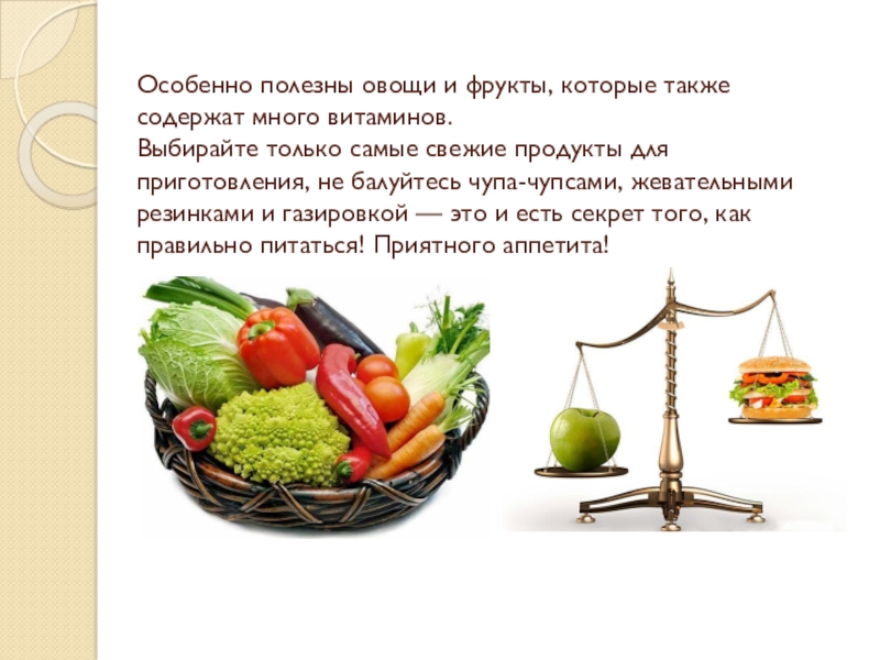 Слайд 10Особенно полезны овощи и фрукты, которые также содержат много витаминов.
