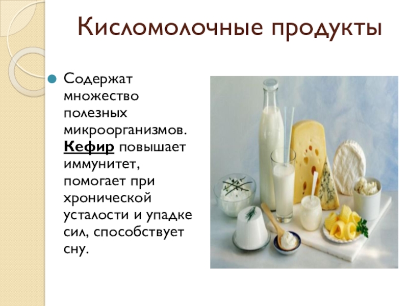 Содержат множество полезных микроорганизмов. Кефир повышает иммунитет, помогает при хронической