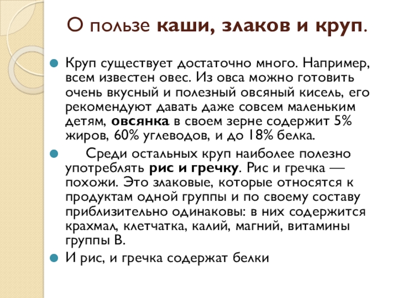 известен овес. Из овса можно готовить очень вкусный и полезный овсяный кисель, его рекомендуют давать даже совсем маленьким детям, овсянка в своем зерне содержит 5% жиров, 60% углеводов, и до 18% белка.