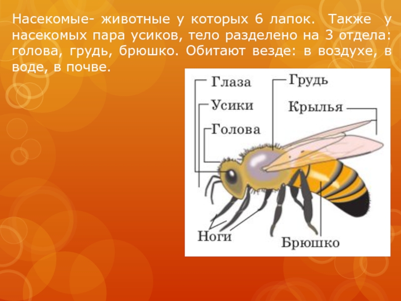 Слайд 15Насекомые- животные у которых 6 лапок. Также у насекомых пара усиков,