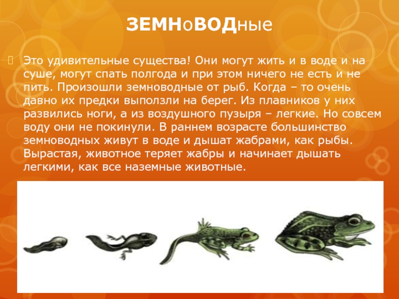 суше, могут спать полгода и при этом ничего не есть и не пить. Произошли земноводные от рыб. Когда – то очень давно их предки выползли на берег. Из плавников у них развились ноги, а из воздушного пузыря – легкие. Но совсем воду они не покинули. В раннем возрасте большинство земноводных живут в воде и дышат жабрами, как рыбы. Вырастая, животное теряет жабры и начинает дышать легкими, как все наземные животные.