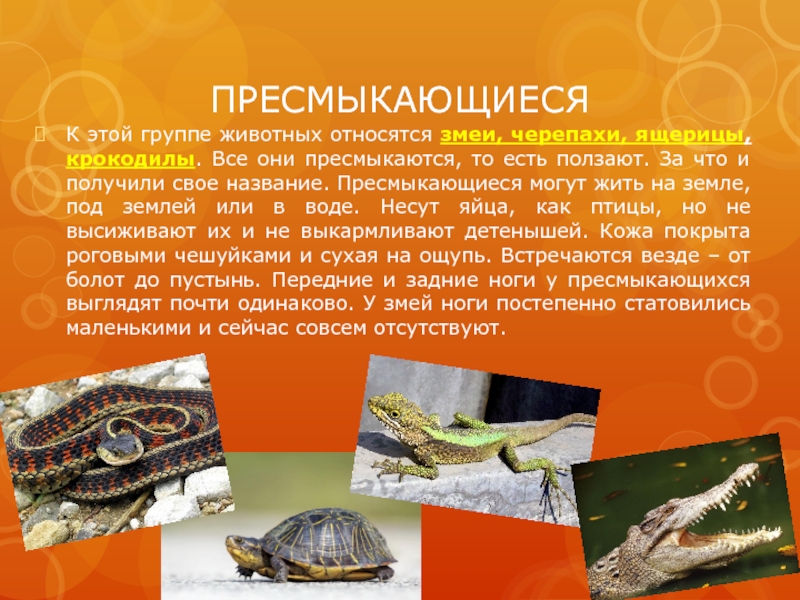 пресмыкаются, то есть ползают. За что и получили свое название. Пресмыкающиеся могут жить на земле, под землей или в воде. Несут яйца, как птицы, но не высиживают их и не выкармливают детенышей. Кожа покрыта роговыми чешуйками и сухая на ощупь. Встречаются везде – от болот до пустынь. Передние и задние ноги у пресмыкающихся выглядят почти одинаково. У змей ноги постепенно статовились маленькими и сейчас совсем отсутствуют.