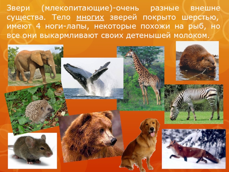 Слайд 11Звери (млекопитающие)-очень разные внешне существа. Тело многих зверей покрыто шерстью, имеют