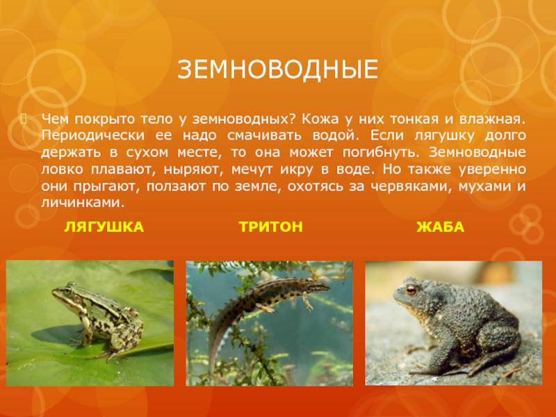 Чем покрыто тело у земноводных? Кожа у них тонкая и влажная.