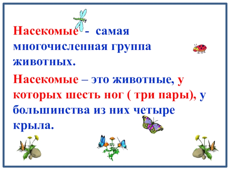 Насекомые - самая многочисленная группа животных. Насекомые – это животные, у которых шесть ног ( три пары),