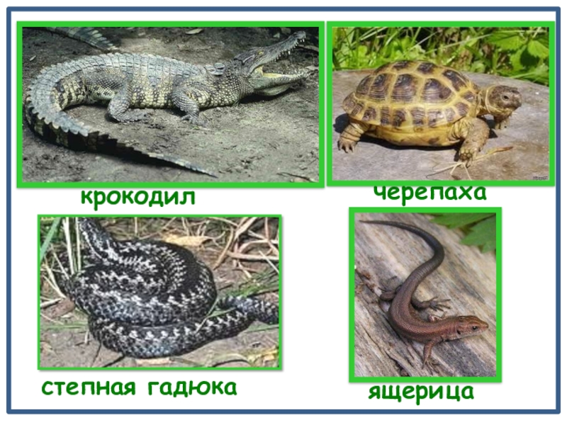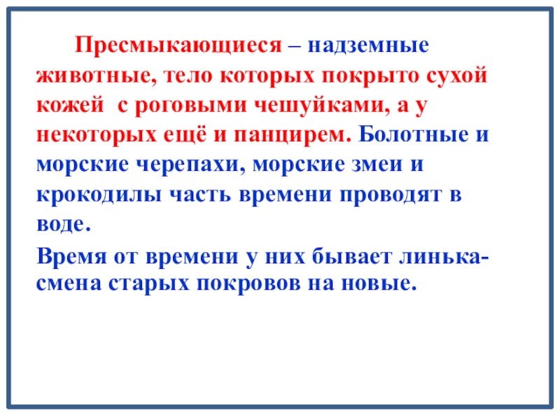 Пресмыкающиеся – надземные животные, тело которых покрыто сухой кожей с роговыми чешуйками,