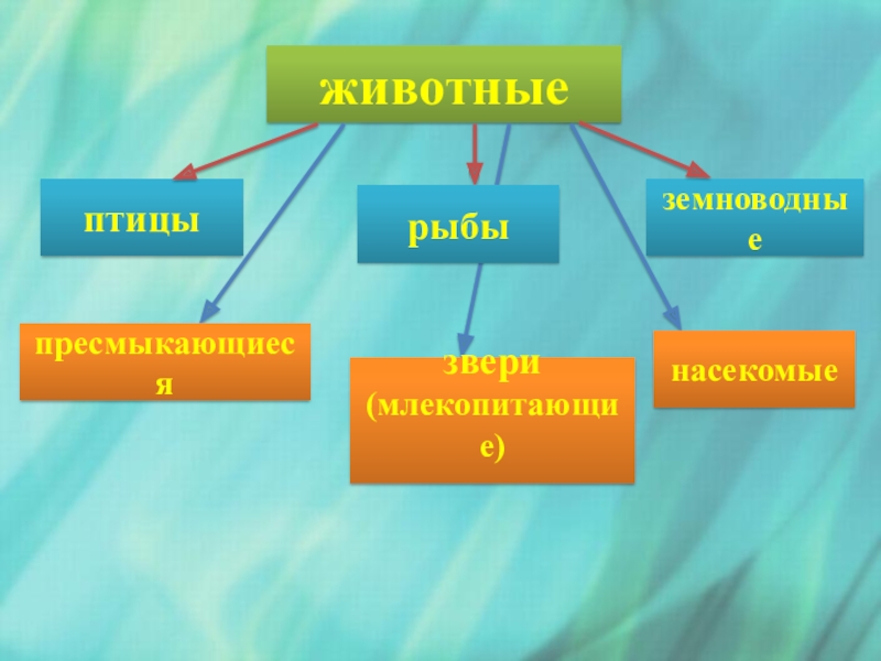 животныептицыземноводныезвери(млекопитающие)рыбынасекомыепресмыкающиеся