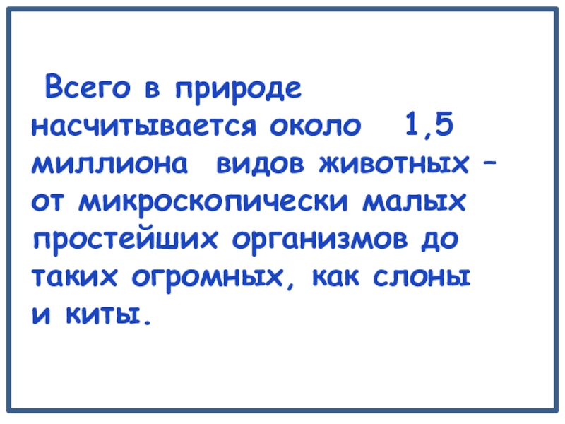 Всего в природе насчитывается около  1,5 миллиона видов животных – от микроскопически