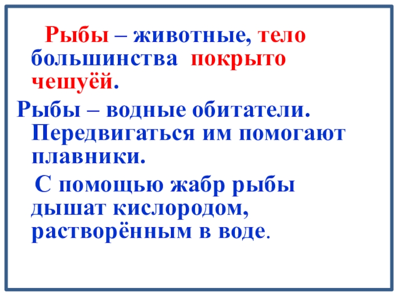 Рыбы – животные, тело большинства покрыто чешуёй. Рыбы – водные обитатели. Передвигаться им