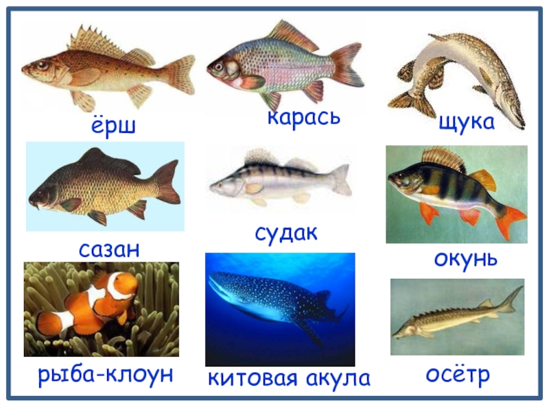 ёршосётррыба-клоунщукасазанокунькарась китовая акуласудак