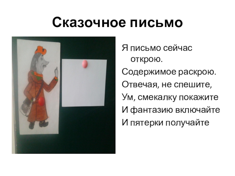 Сказочное письмоЯ письмо сейчас открою.Содержимое раскрою.Отвечая, не спешите,Ум, смекалку покажитеИ фантазию включайтеИ пятерки получайте