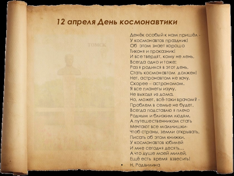 пришёл - У космонавтов праздник! Об  этом знает хорошо Тихоня и проказник! И все твердят, кому не лень, Всегда одно и тоже: Раз я родился в этот день, Стать космонавтом  должен! Нет, астронавтом не хочу. Скорее – астрономом. Я все планеты изучу, Не выходя из дома. Но, может, всё-таки врачом? - Проблем в семье не будет, Всегда подставлю я плечо Родным и близким людям. А путешественником стать Мечтают все мальчишки- Чтоб страны, земли открывать, Писать об этом книжки. У космонавтов юбилей И мне сегодня десять… А что душе моей милей, Ещё есть  время  взвесить!