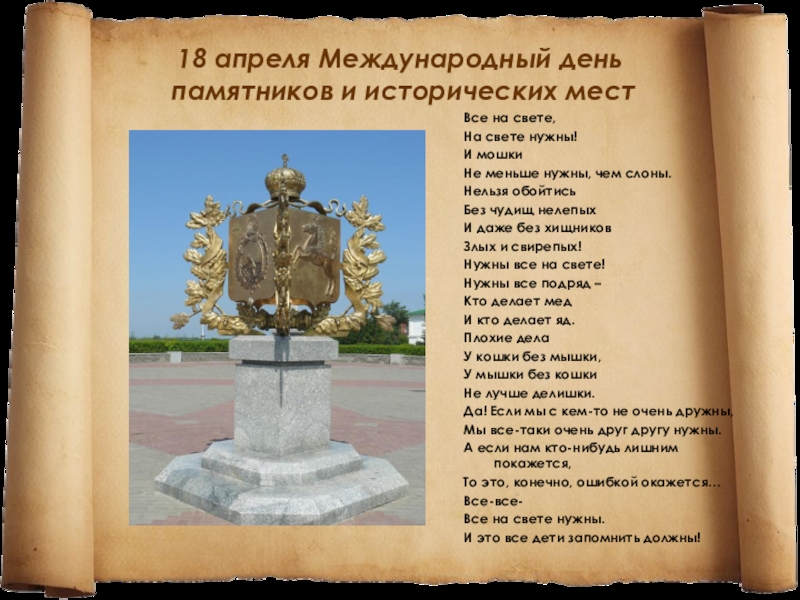 18 апреля Международный день  памятников и исторических местВсе на свете,На свете нужны!И мошкиНе меньше нужны, чем