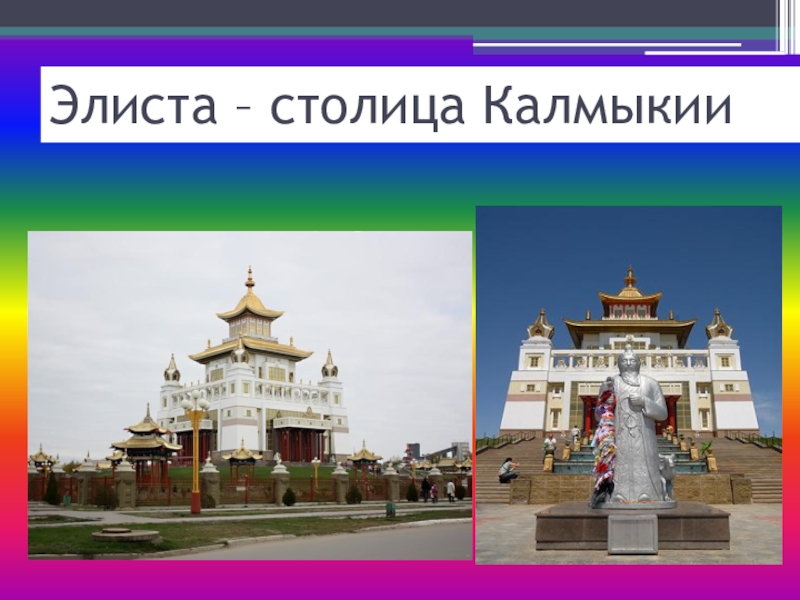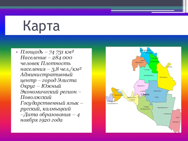 КартаПлощадь – 74 731 км² Население – 284 000 человек Плотность населения – 3,8 чел./км² Административный центр – город Элиста Округ – Южный Экономический регион – Поволжский Государственный язык – русский, калмыцкий –Дата