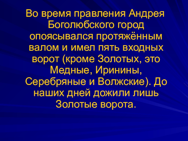 Слайд 27 Во время правления Андрея Боголюбского город опоясывался протяжённым валом