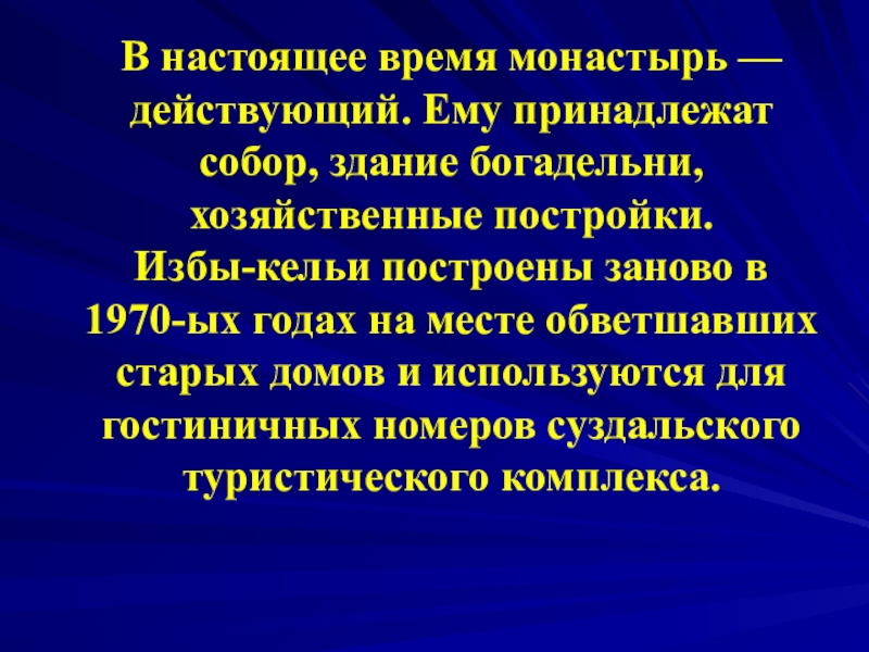 Слайд 62В настоящее время монастырь — действующий. Ему принадлежат собор, здание богадельни,