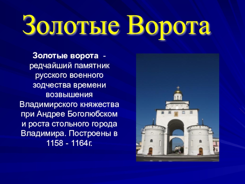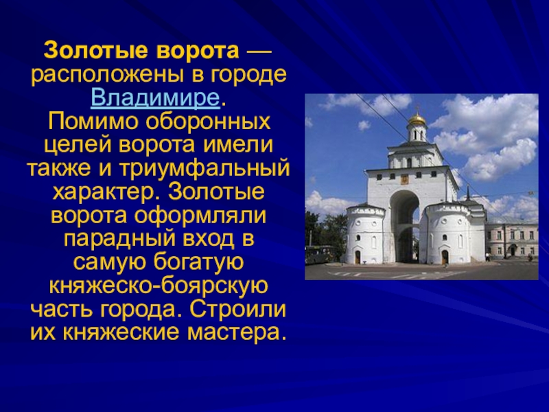 Слайд 26 Золотые ворота — расположены в городе Владимире.