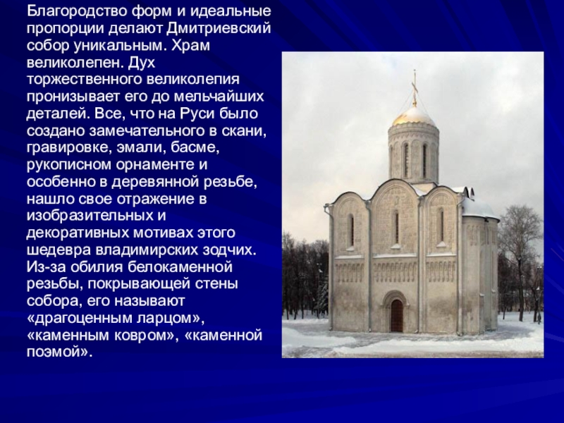 уникальным. Храм великолепен. Дух торжественного великолепия пронизывает его до мельчайших деталей. Все, что на Руси было создано замечательного в скани, гравировке, эмали, басме, рукописном орнаменте и особенно в деревянной резьбе, нашло свое отражение в изобразительных и декоративных мотивах этого шедевра владимирских зодчих. Из-за обилия белокаменной резьбы, покрывающей стены собора, его называют «драгоценным ларцом», «каменным ковром», «каменной поэмой».