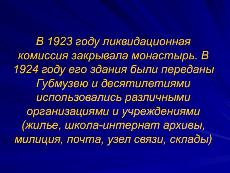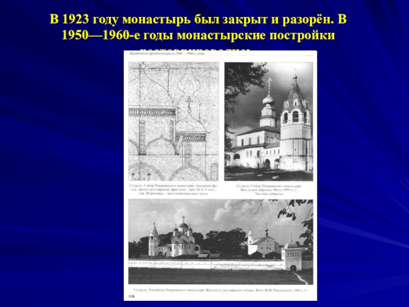 Слайд 60В 1923 году монастырь был закрыт и разорён. В 1950—1960-е годы