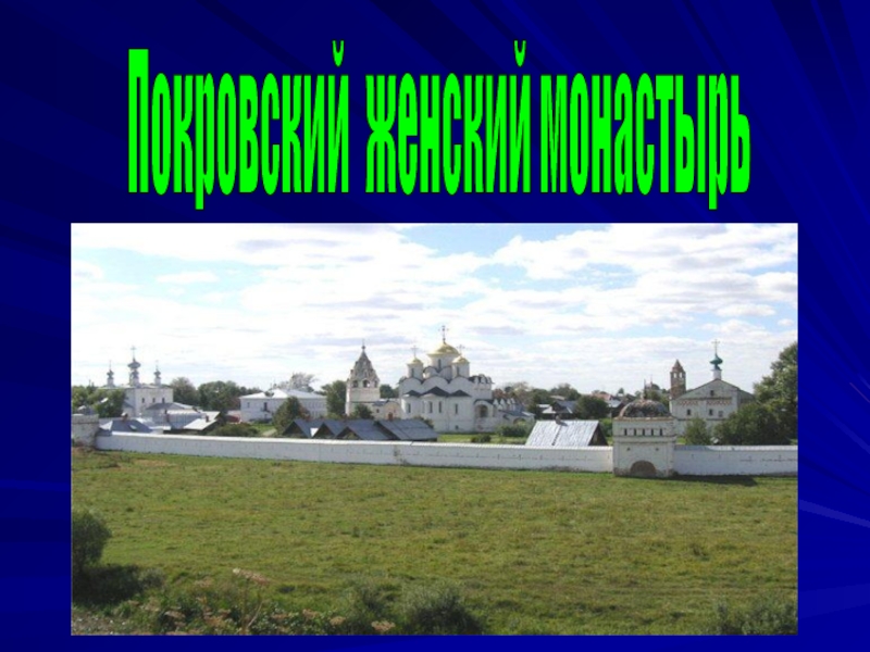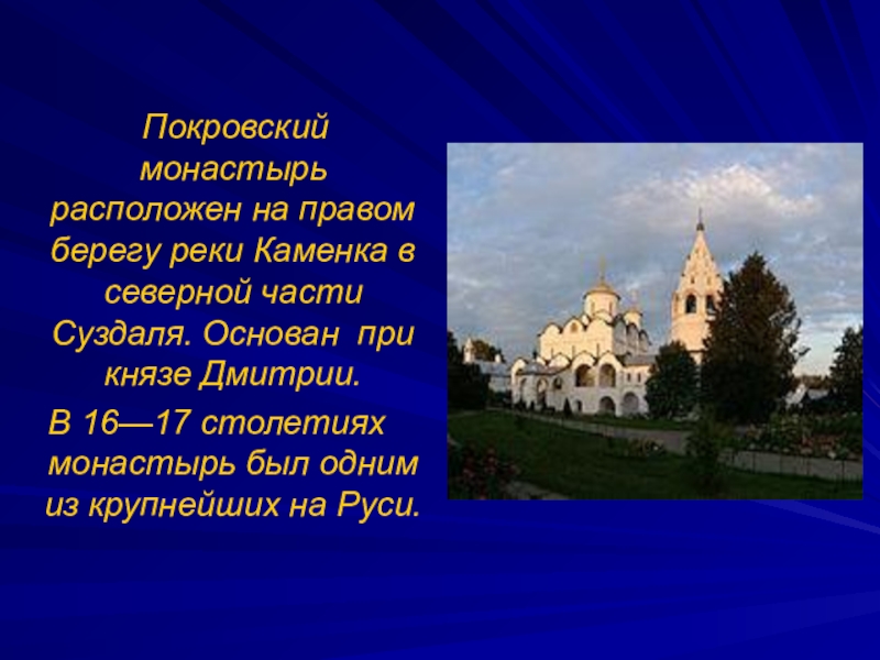 Слайд 58 Покровский монастырь расположен на правом берегу реки Каменка в