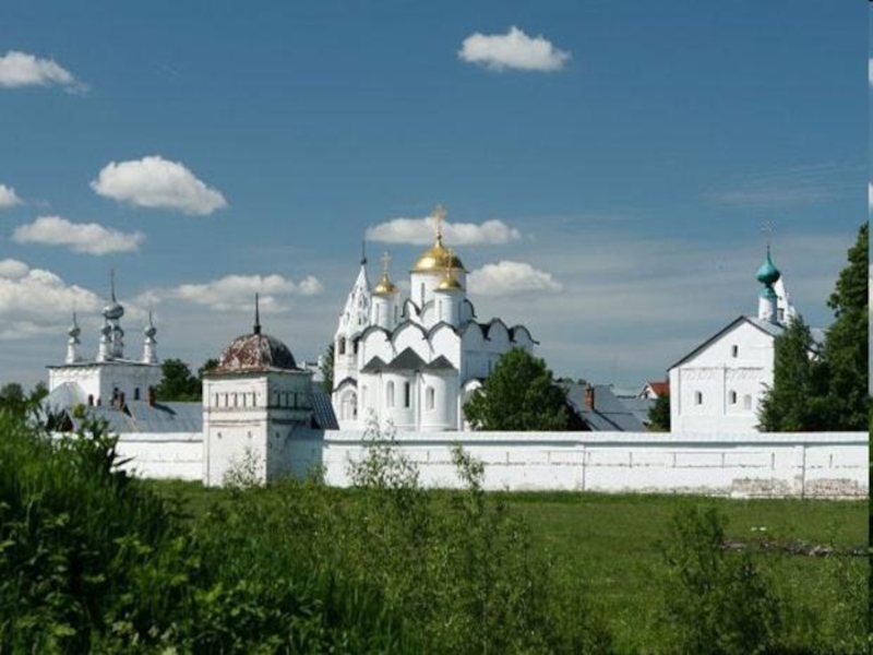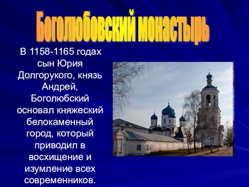 Слайд 47 Боголюбовский монастырь возник в 13 веке. Монастырь был