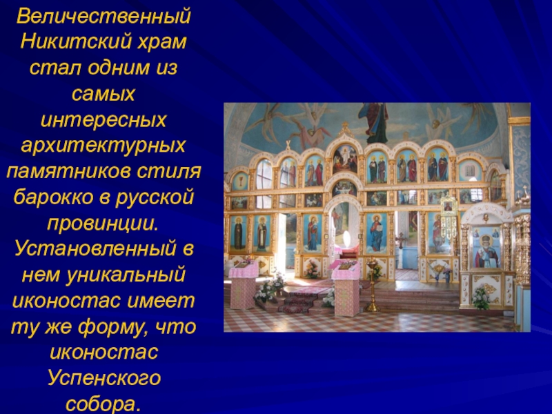 барокко в русской провинции. Установленный в нем уникальный иконостас имеет ту же форму, что иконостас Успенского собора.