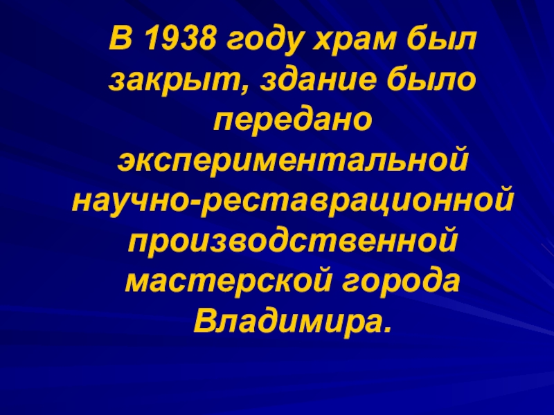Слайд 43В 1938 году храм был закрыт, здание было передано экспериментальной научно-реставрационной